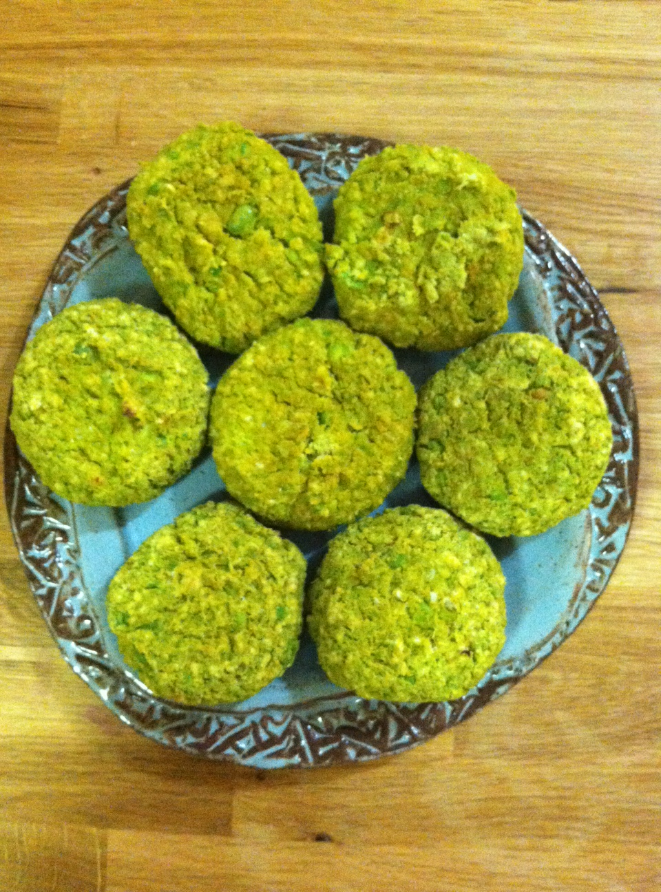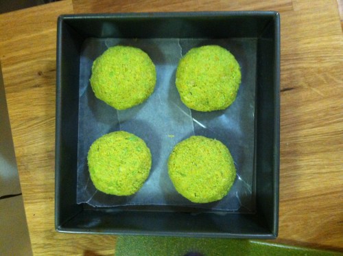 Place parchment paper on the bottom of a baking pan, and mold the edamame paste (for lack of a better word) into three inch patties – you’ll have enough for eight burgers. Place ’em in the fridge to set for ten mintes or so – turn on the oven to about 400 degrees.