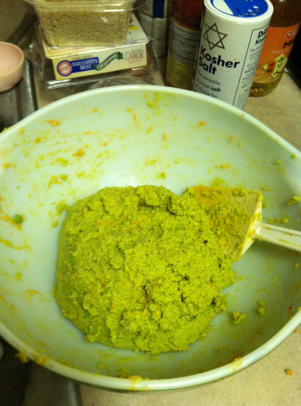 Small amount by small amount, use a food processor to puree into a paste. I don’t mind eating a couple whole edamame beans, and I don’t have the biggest food processor, so I made what I had work. Fold in the egg whites and panko crumbs.
