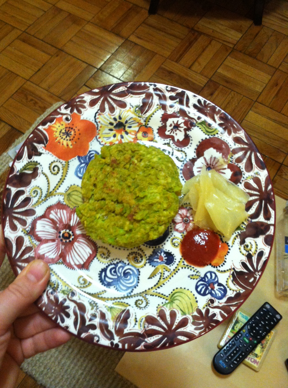 I really thought I was going to write a post a day. Ha! That didn’t happen. But I’m back. And I’m cooking. Healthy. Vegetarian. High protein. You name it. Check out this delicious recipe – edamame soy burgers with sri racha and pickled ginger on top. I found the recipe online a couple years ago, but added and changed things around based on what I have. I definitely recommend making these.