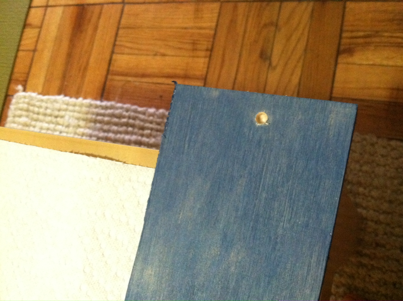 First, paint the piece of wood. I wanted  just a lite, rubbed-on coat. I took a paper towel, and lightly painted the wood in the direction of the grain.
