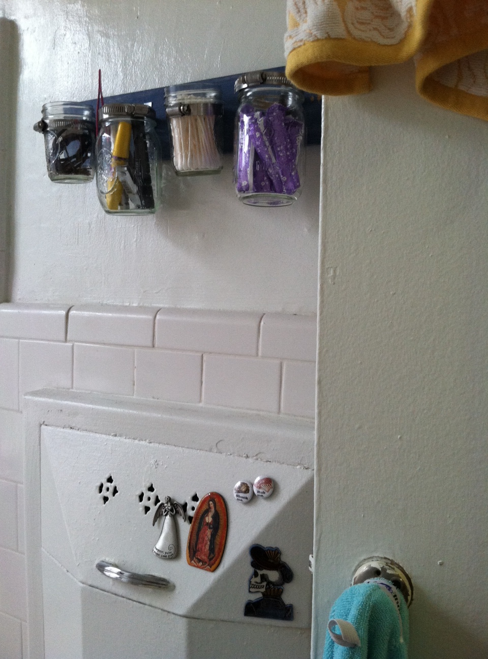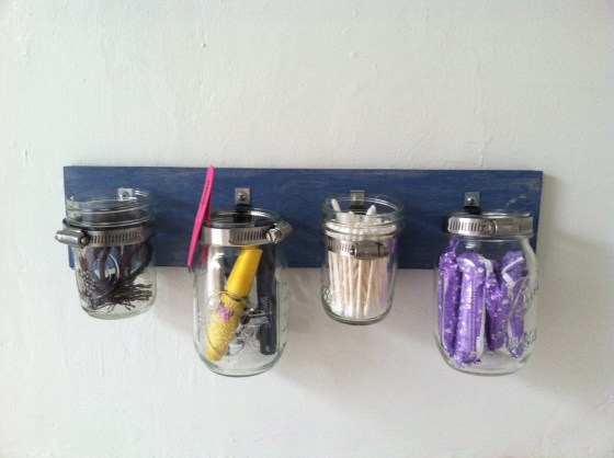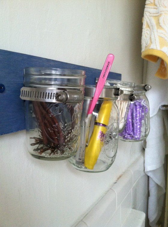Attach the piece to your wall – mine is in the bathroom – and there you go! A pretty simple, and somewhat fast project that will create space in your bathroom, recycle jars (if you are smarter than me) and decorate your space in a unique and artistic way. Next, I’m going to make one for my kitchen to store utensils – mine are currently in jars as there is no drawer. Thanks!